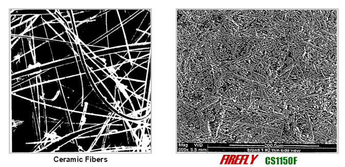 The pictures is a comparison of the fibre structure, showing a much more homogeneous structure for CS1150F filters, compared to ceramic fiber.